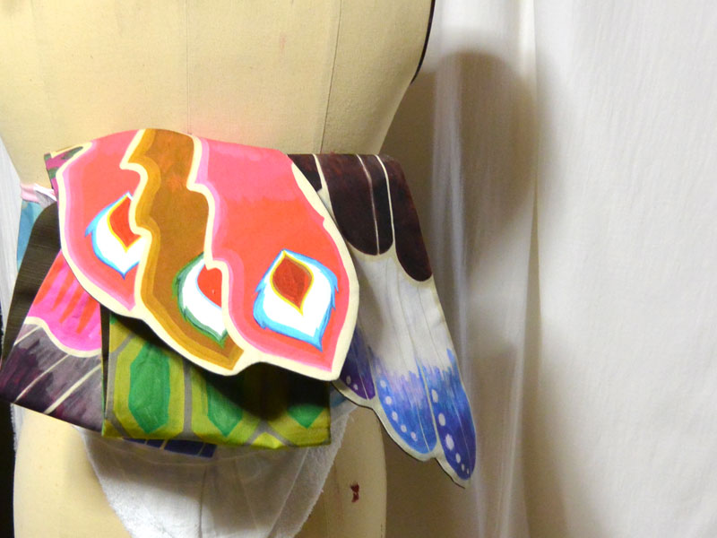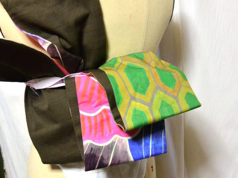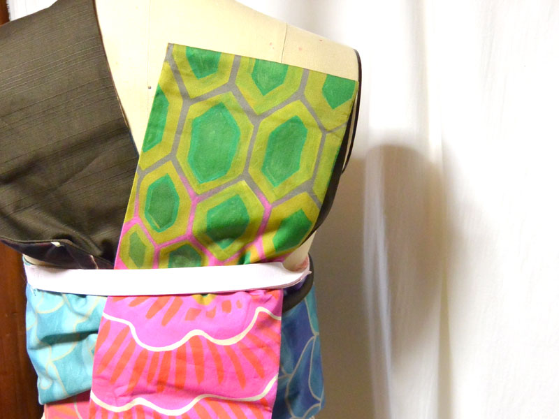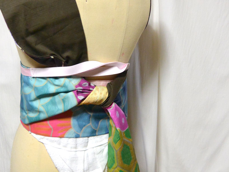 2016/07/29 Category : 未選択 帯の結び方について お問い合わせを多く頂きますので当サイトでよく使う結び方を写真で説明いたします。 私はその場その場で適当に結ぶだけのおおざっぱ結びなのであまり参考にならないかもしれません。 ・説明下手なのでかなり分かりづらいかと思います…申し訳ありません。 半巾帯の結び方を教えて下さる素晴らしいサイトが沢山ありますのでそちらもご覧下さい。 本当に説明下手で申し訳ないです…。 半巾帯の結び方 三重仮紐を使った半巾帯の結び方 1 手を短めにとり、手を上にしてひと結びします。手の上に三重仮紐を結びます。 (写真ではねじれてしまってますが^^; 奇麗に結んでくださいね) 2 たれを折り一番奥のゴムに通します。 3 さらにたれを折り、真ん中のゴムに通します。 3 たれ先を一番奥のゴムにプリント生地が表にくるように挟みます。 手先も同じように一番奥のゴムに挟みます。 挟む際に他の折ったパーツより奥へ押し込むように挟んでください。 4 全て倒して形を調整します。仮紐は胴と帯の間に落としこんで隠してください。