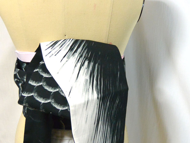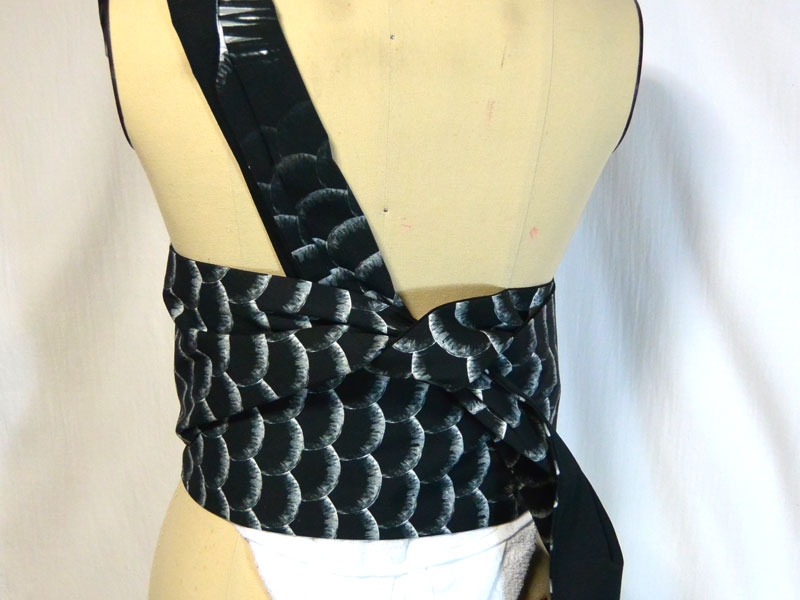 2016/07/28 Category : 未選択 帯の結び方について お問い合わせを多く頂きますので当サイトでよく使う結び方を写真で説明いたします。 私はその場その場で適当に結ぶだけのおおざっぱ結びなのであまり参考にならないかもしれません。 ・説明下手なのでかなり分かりづらいかと思います…申し訳ありません。 半巾帯の結び方を教えて下さる素晴らしいサイトが沢山ありますのでそちらもご覧下さい。 本当に説明下手で申し訳ないです…。 半巾帯の結び方 三重仮紐を使った半巾帯の結び方 1 手を長めにとり、手を上にしてひと結びします 2 仮紐を結びます。 一カ所しか通さないので腰紐等でも大丈夫ですがゴム製のものが使いやすいです。 3 たれを折り仮紐に通します 4 同じたれの先を先ほど折ったものより奥に通します。 5 挟んだたれをさらにひっぱり仮紐から長く出るようにします。 6 たれを手前に倒します。 7 手を仮紐に同じように通します。 8 それをまた同じように手前に倒します。その後形を調整し仮紐を帯と胴体の間に落としこみ隠します。 下の写真は手(上の写真の左側のヒレ模様のほう)をさらに折って挟んだものです。 一番始めに結ぶ時に手をもう少し短めにとるとバランスがとれると思います。